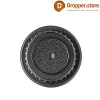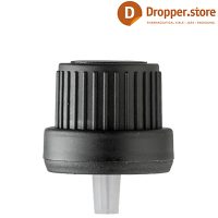 The CD18-03 is a Black PP 18 tamper-evident dropper cap with inner dropper plug (0.9 inch orifice).