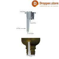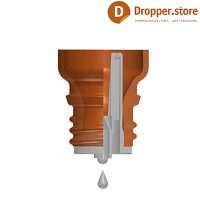 This cap is specifically designed for small glass bottles with an 18 DIN neck finish. When the cap is fully screwed down it forces a natural colored plastic orifice reducer and inverted dropper tip into the opening of the bottle.