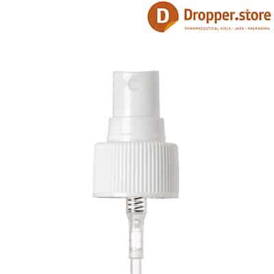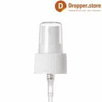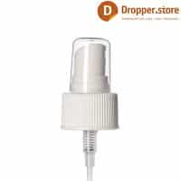 The Spray Pump PP24 in White Glossy Color Ribbed Closure , dimensional 24-410 with a transparent plastic dip tube and a transparent protective cover. Can be used for fine liquids and fragrances .